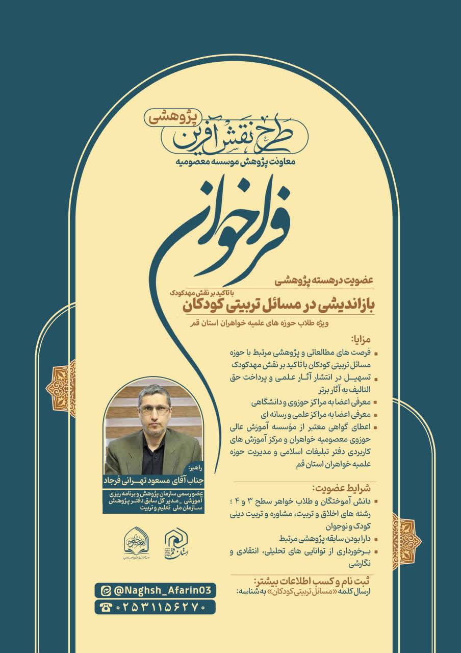 - دانشآموختگان و طلاب سطح ۳ و ۴ در رشتههای اخلاق و تربیت دینی کودک و نوجوان